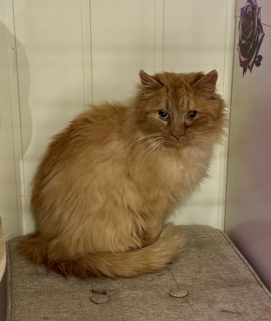 Katten hadde store problemer med øynene. Vokste pels ut av øyegropene.