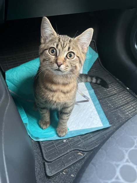 Ung katt, veldig kjælen og tam. Svart haletipp.