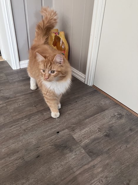 Mistenker at han er innekatt eller har hatt en ugrei opplevelse ute. Han er svert verbal, mjauer masse og følger etter den som er med han.
