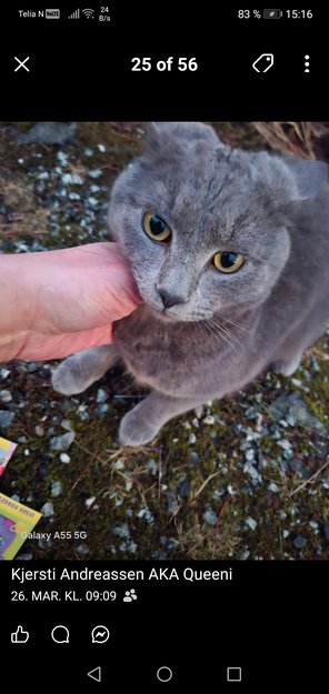 Frø jente pus med gule øyne har blitt oppservert I fjellavegen en stund nå og hun har vist plaget de andre kattene I nebolaget der så er viktig at hun blir hentet snarest.