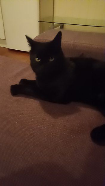 Helt sort katt, 3 år gammel så han er veldig liten og tynn, sort nese og grønne øyer