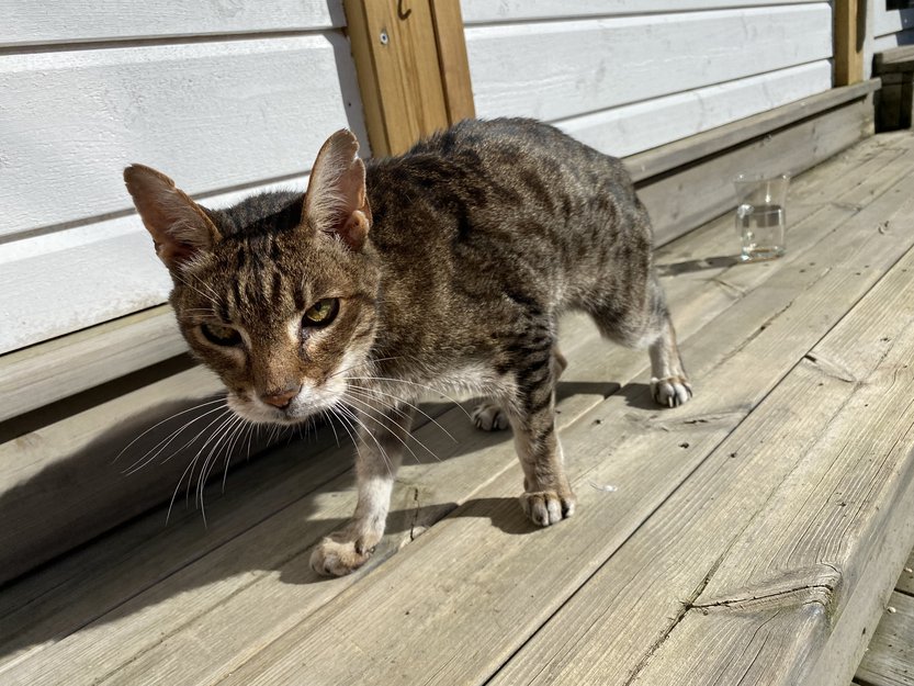 Avmagret katt funnet, grå med svartbrune prikker på kroppen og svartbrune striper oppå langs ryggen. Den var veldig kontaktsøkende og det virker som den kaller på noen, den mjauer og titter liksom rundt seg etter noen. Den fulgte etter meg hjem (100m unna). Den er kjælen, den ville ikke ha noe mat, tross den virker avmagret og skranglete.