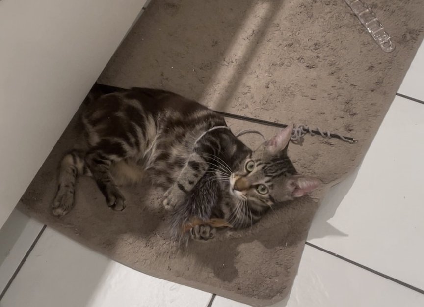 Ser ut som en bengaler, men har sorte, grå og brune tegninger. Lyst snuteparti. Ungdom. Er sky.