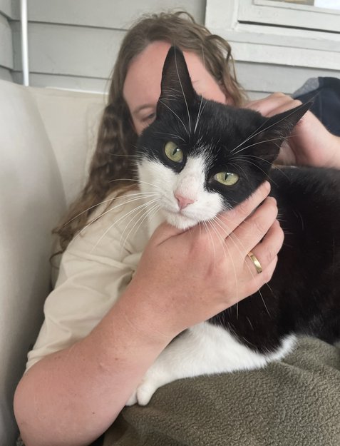 Korthåret, sort og hvit katt. Hun er hvit i ansiktet og nedover magen, samt potene.