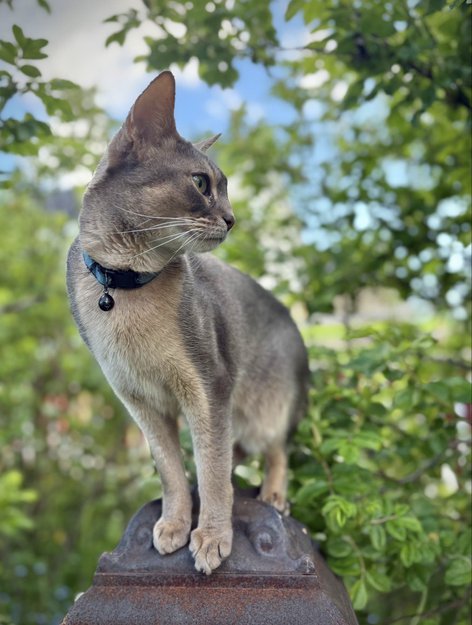 Liten grå katt med vaniljefarget brystparti. Har orange halsbånd med telefonnummer på.