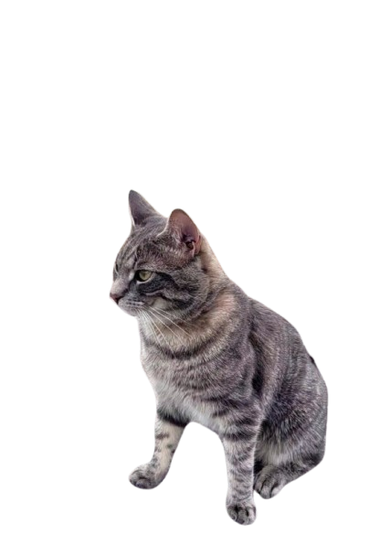 Gråstripet katt, grå ben, noe striper på forlabber, striper nedover langs halen. Kremfarget bryst.