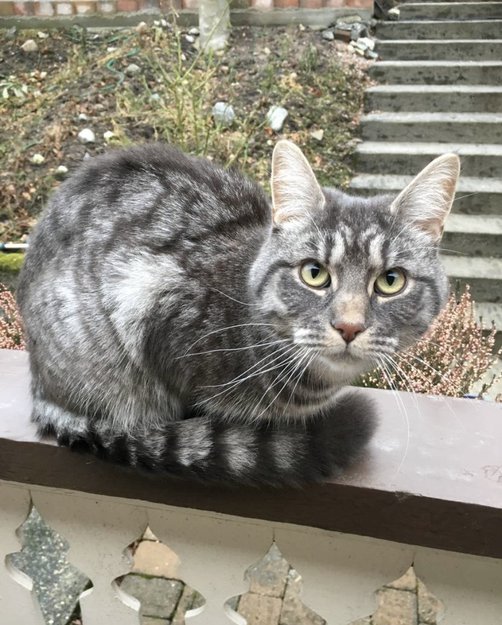Stor hannkatt, gråspraglete, lang hale, lite hakk i det ene øret.