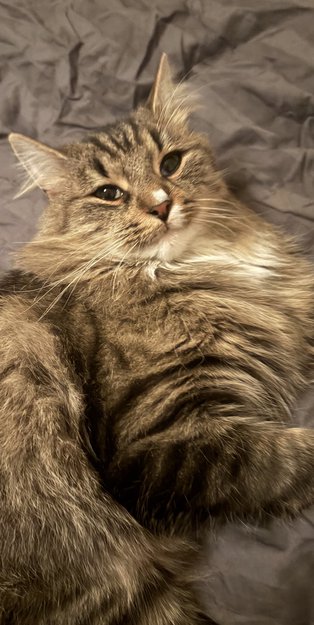 Brungrå Tigerpels, langhåret, hvite poter, hvit flekk på nese, blanding Bengal, skogs katt, main clone,