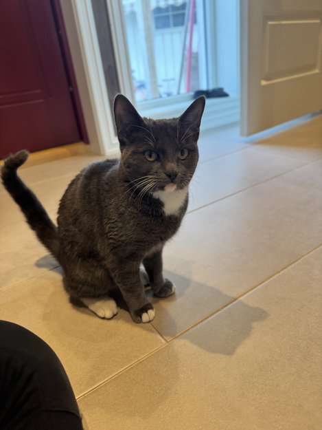 Grå/sort kattunge med hvitt parti under haken og hvite labber. 3-4 mnd gammel kanskje.