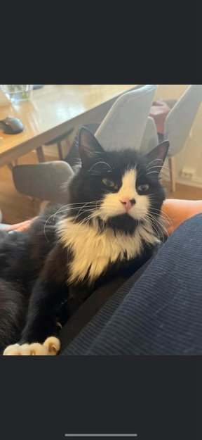 Sort og hvit, sort på nesen, hvite sokker på bena. Stor hale.