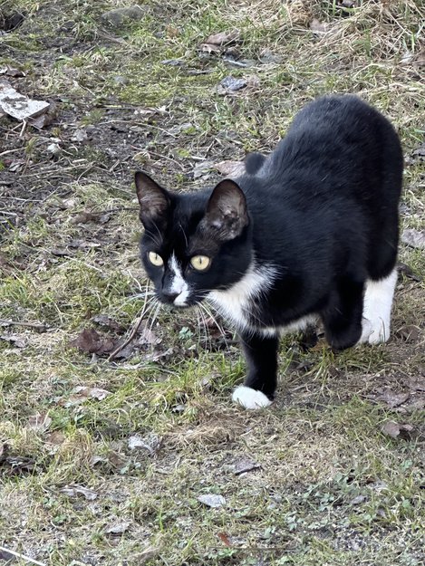 Denne katten har begynt å overnatte i låven vår. Den var visst her hele sommeren i fjor også. Vet ikke om den har vært hos eieren sin i vinter eller ikke. Den er sjenert og skvetten men veldig koseste når den får noe mat. Den har muligens løpetid siden det befinner seg en hannkatt her og hun bruker hele dagen på å stirre i retningen hvor den bor.