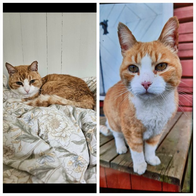 Rød og hvit hankatt oppholdt seg lenge i feiringvegen 2463. Eldre kastrert hankatt, antatt minst 7 år. Ikke chip.