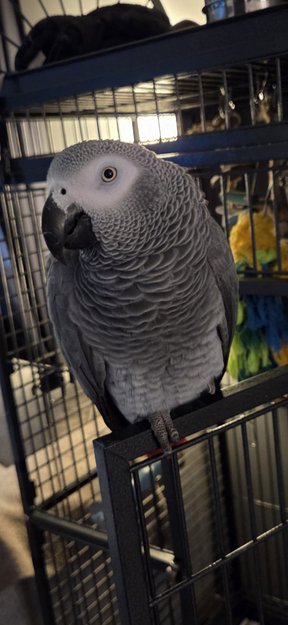 Grå fugl på størrelse med liten kråke. Har ringmerke på fot.