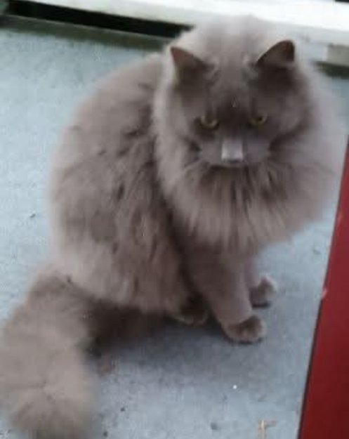 Stor koksgrå hannkatt med fluffy hale. Litt lysere farge på nesetippen. Hadde på seg rødt halsbånd med en bjelle, men kan jo ha mistet den.