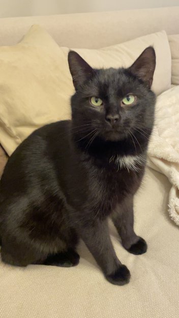 Adoptivkatt som skulle ut på sin første luftetur i hagen vred seg ut av selen og forsvant. Han er nok skremt, og lyder ikke navnet sitt ordentlig enda. Har delvis ukjent bakgrunn og har bare vært hos oss siden februar og frem til nå bare vært inne og litt på terrassen. Han er kastrert, chippet og øre tatovert.