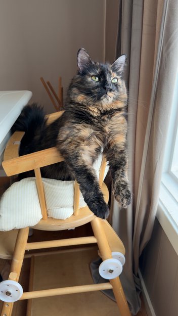 Flerfarget pus med et rødt merke over høyre øye. Hun lyder navnet Blomst og responderer ofte etter navnet sitt. Blomst er 1,5 år og litt lita.