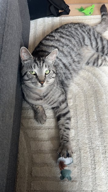 Milo er 3 år og kastrert. Han er grå med sorte striper. Han har grønne øyne, sort strek langs ryggen og svart haletipp. Normal til stor i størrelse. Kan være skeptisk til nye mennesker.