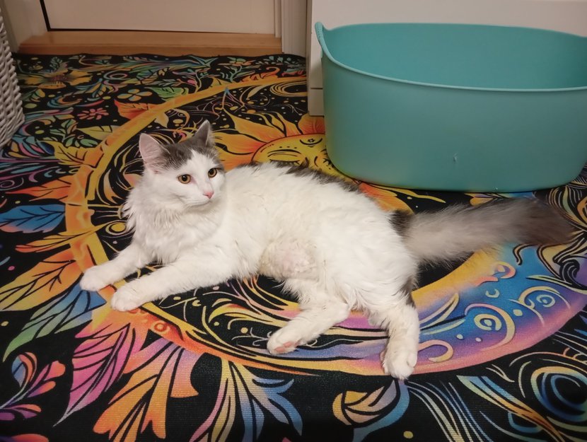 Hvit med grå på hodet, stor grå flekk po ryggen mot rumpa, en mindre flekk på ryggen mot nakken. En grå flekk venstre bakerst bak beina. Fint fluffy grå hæl.