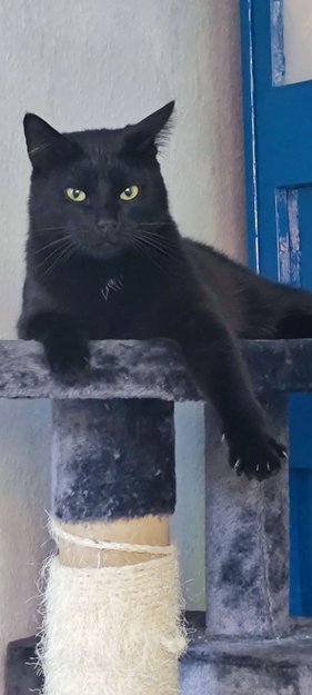 Stor, helsvart, korthåret, gule øyne og to små hvite flekker i pelsen. Noen hvite hår på brystkassen, og en større hvit flekk ned på magen/skrittet. Overvektig, og kan se magen sveie fra side til side når han løper.