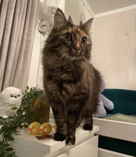 Brun, svart, hvit hunnkatt savnet i Indre Østfold
