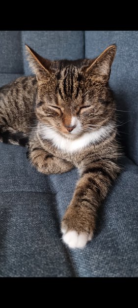Liten av størrelse. Hvit flekk på alle poter, halve nesen og hvit på magen. Ellers brun, gylden, og svart tigerstripet og prikkete i pelsen.