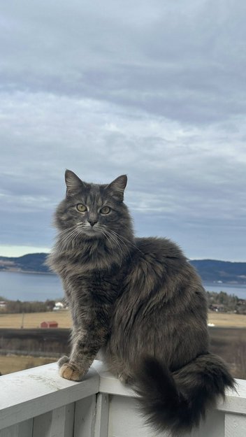 Silkemyk grå pels med innsalg av noe brunt og hvitt, stor hale . Er chippet.