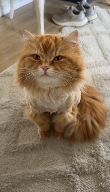 Nybarbert løveklipp, og har et stor arr på ryggen. En stor hannkatt på nesten 10 kg.