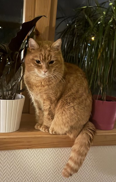 Mille er en 8 år gammel rød hunnkatt som er litt sky og tar ikke kontakt med mennesker. Hun er i godt hold, rundt 5 kg. Tigerstripet hale, veldig fin og god pels. Et lite hakk i høyre øre.