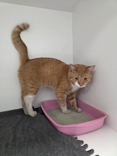 Oransje pus med hvite tegninger. Hvit melkebart som strekker seg opp mot venstre øye. Lange sokker på bakbein og høyre frembein, kort sokk venstre frembein. Hvit fra under hake og ned mot mage. Mørkere striper av oransje i ansikt og nedover bein. Ukastrert og kosete.