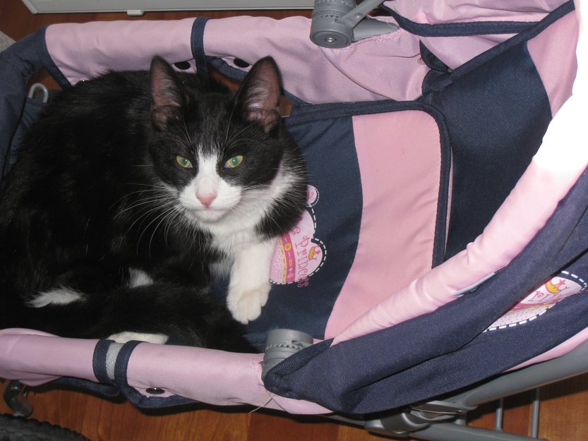 Hvitt felt foran på nesa og opp mellom øynene, det hvite deler seg som en v rett over øynene. Hvitt bryst og hvit på deler av bena. Han er veldig nysgjerrig, kosete, sosial og glad i barn.