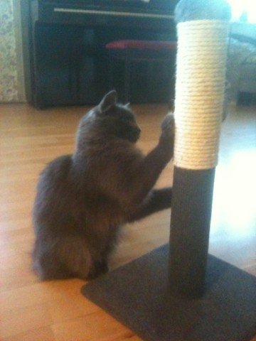 Ung hunnkatt, med grå semilanghåret pels. Hun har en hvit flekk under haka. Leken, snill og veldig kjælen.