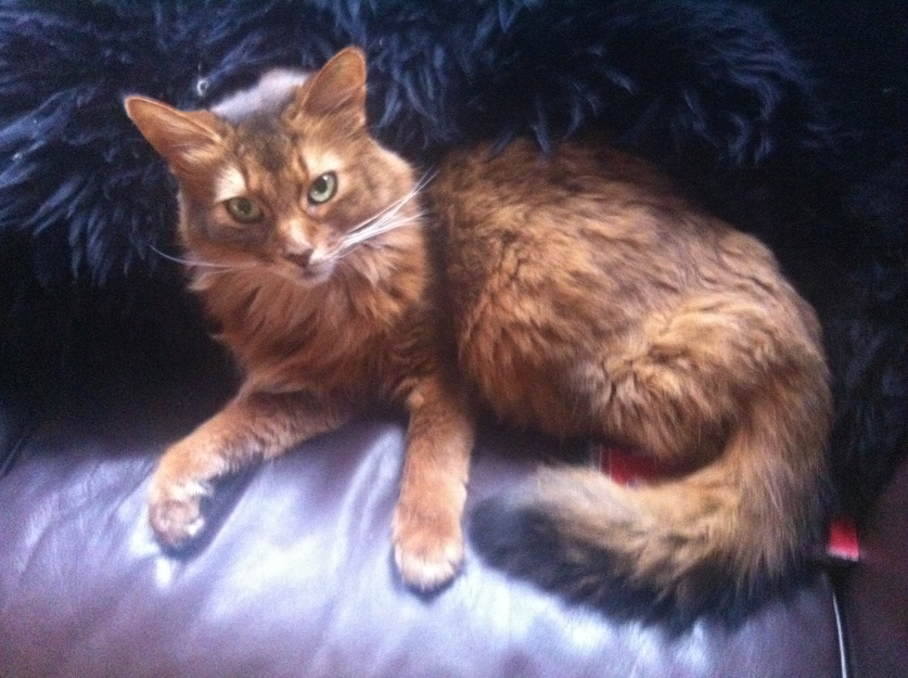 Katten er en langhåret Somali Abyssiner katt, og har rødbrun pels (Ekorn/revefarget)