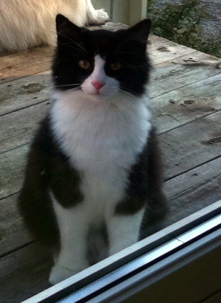 Skipskatt, sort og hvit, langhåret pels. Hvite forlabber, hvit tegning i ansiktet. Det sorte i pelsen er nesten brunlig i lyset.