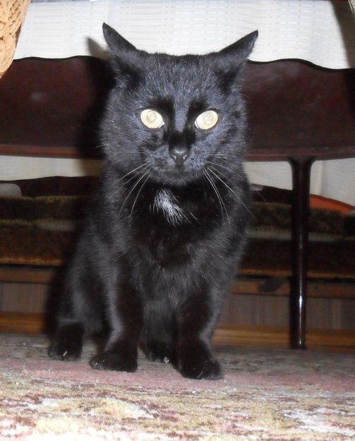 Katten har tatovert inn 5 ulike tall i øret. Hun er helt svart og har en liten hvit flekk på brystet. Hun er 6 år gammel, voksen kattejente.