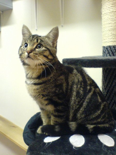 Hannkatt, ca 6 måneder, grå/brun med svarte tigerstriper, blank og fin i pelsen, i godt hold.
