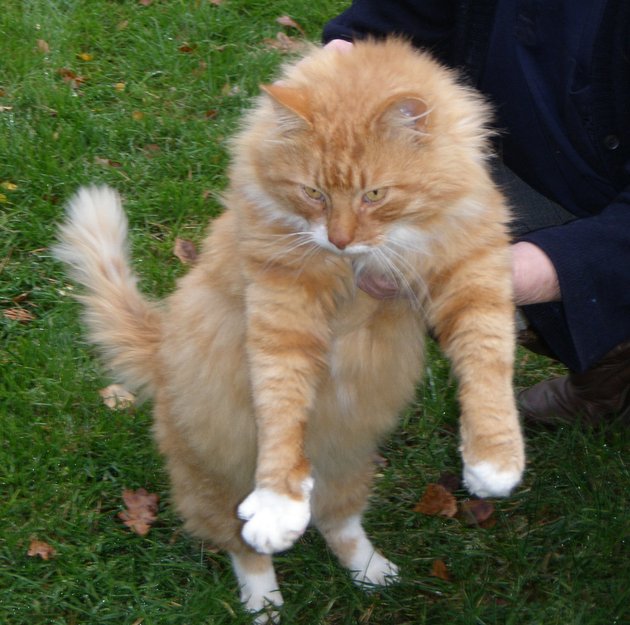 Langhåret rød og hvit. Hvitt skjortebryst, hvite poter og hvitt på halen. Ungkatt, uvisst om chippet, men ingen øretatovering. Tillitsfull og åpenbart vant til å få komme inn. Pratsom.