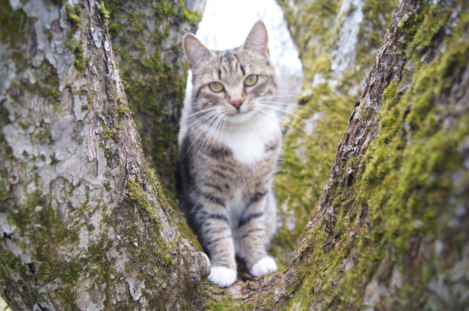 Liten hunnkatt på 2,5 år. Lys brun med mørke tigerstriper på ryggen. 4 hvite "sokker", hvit på brystet og på magen, halen er stripete.