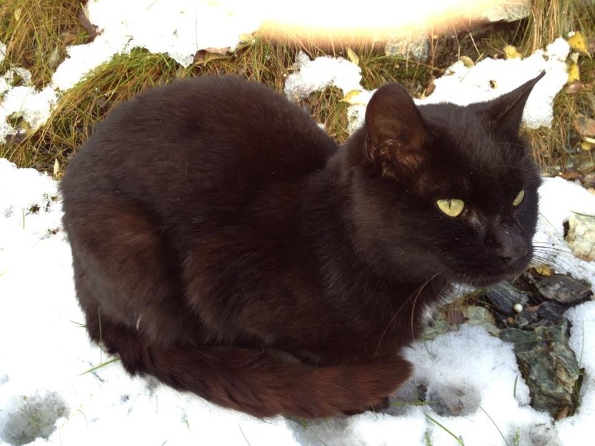 Denne er en liten svart hunnkatt--pelsen har en glans av rød/brun når lyset skinner på den. Også har en bitteliten prikk av hvit på brystet.
