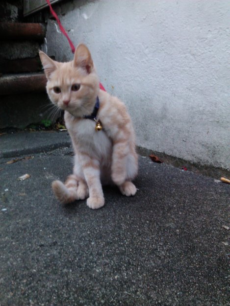En liten kattunge løp rundt en natt i nabolaget uten å ane hvor han skulle. På morgenen fikk vi tak i den, og ringte på hos alle i nabolaget, men ingen kjente til kattungen. Den ble da tatt med hjem, hvor den har vært i ca. to uker. Har letet etter eier uten hell.