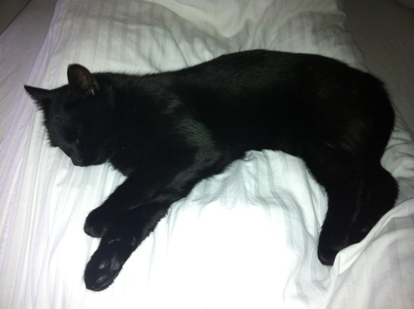 Nå er han heldigvis kommet hjem og har fått fisk å spise. Den forsvant på et øyeblikk. Deretter gikk han rett i senga og la seg. Maler som bare det når vi koser med han.