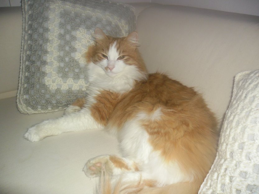 Katten vår Fløffen er rød og hvit. Han har langpels, men er klippet litt på den ene siden pga klumper i pelsen. Han er kosen, men han er redd barn.