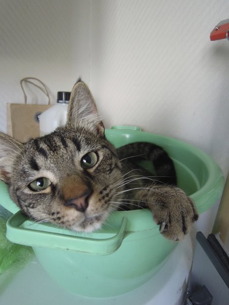 Middels stor, stripete, kastrert hannkatt, lite sår ved høgre tinning - da han stakk av hadde han ein plastkrage rundt halsen