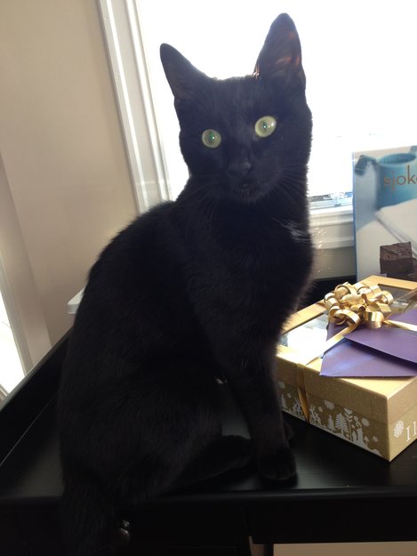 Han er helt svart med en liten hvit flekk på halsen, og han er en skipskatt (dvs. har flere tær enn normalt). Veldig kosete. Ca. 18 mnd gammel.