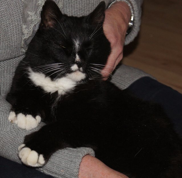 Katten oppsøkte oss. Virker som om den ikke vil videre. Etterhvert har vi tatt den inn og foret den og sluppet den ut igjen. Men katten er stadig her. Den kommer så fort den hører oss. En riktig fornøyelig kattejente. Veterinæren antyder at hun er mellom 1-2 år, men er selvfølgelig ikke helt sikker på det.