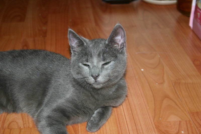 Helt grå, svake striper på halen. Hakk i det ene øret.