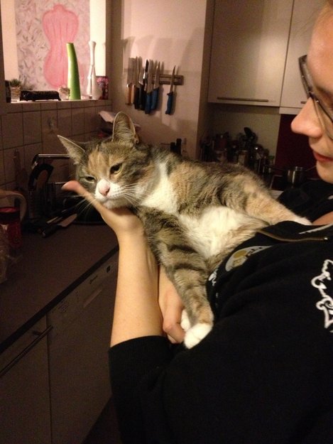 Katten var utenfor og veldig redd, vi fikk til slutt fanget henne i en felle vi lånte av dyrebeskyttelsen. Hun er nå lykkelig inne i varmen med oss.
