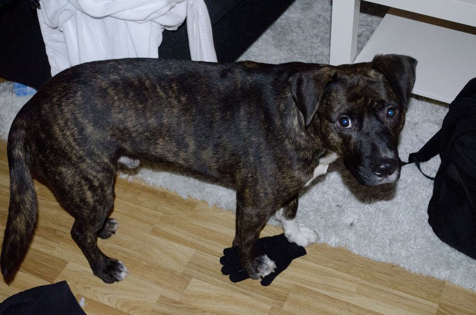 Tigerstripet svart/brun, venstre labb på forbeina er hvit, hvit på brystet. Godt bygd, den har fått mat i det siste og den har en del muskler. Utrolig hyggelig, litt bråkete av seg. mellomstor hund, ser ikke helt fullvoksen ut.