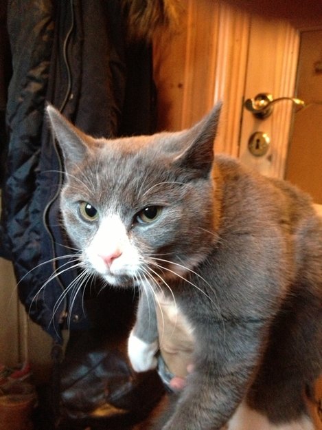 Funnet på kvelden 07.12.12, stod utenfor døra og pep. Sosial, tørst og sulten, Naboer har sett katten i noen dager. Har et halsbånd med perle. Vil bli sjekket for chip i dag, 08.12.12. Tror det er en hannkatt, men er ikke helt sikker. Den er ikke så gammel, trolig godt under ett år.