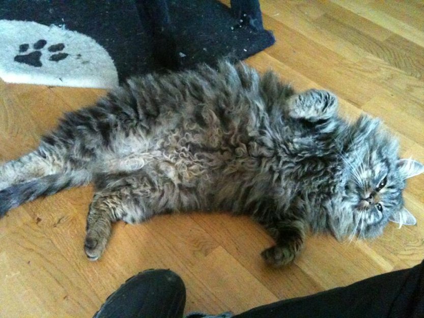 Liten katt med stor mage. Klumper rundt halsen etter muligens halsbånd.