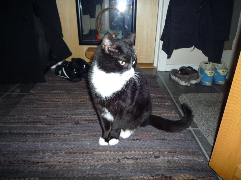 Svart kastrert hannkatt,hvit under hals og bryst,hvite poter,hvit snute,han er ganske lang.Er sky.Heter Muffe,men usikkert om han lyder navnet. Er veldig hjemmekjær,liker ikke barn,da gjømmer han seg.